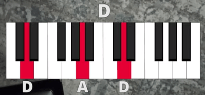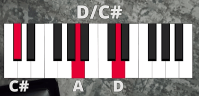 But you’re already playing a D chord with your right hand, so that doesn’t have to change. Instead, you’ll only have to step your left hand down from the D to the C#, so it will look like this: