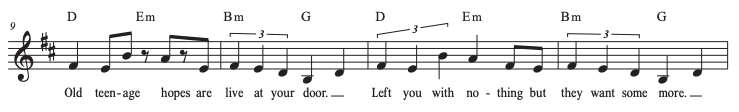 Things change a little bit when we get to the pre-chorus (or second line of the verse, however you want to think about it). Now we are going to swap out that D/C# slash chord and replace it with an Em chord: