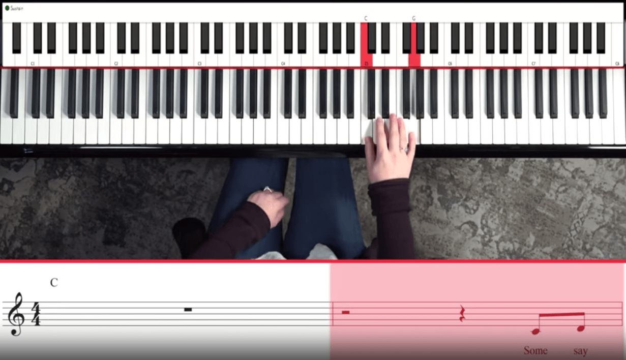 As you can see, we’re now playing the notes C-E-G in the right hand. In the left hand, continue to play the same single notes that you did in “The Rose”.