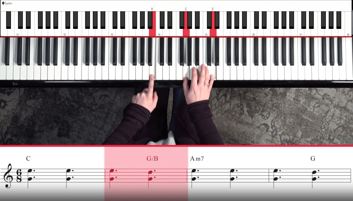 Remember the letter in front of the slash tells you what chord to play with your right hand (G), and the letter after the slash tells you what note to play with your left hand (B). It’s that simple.