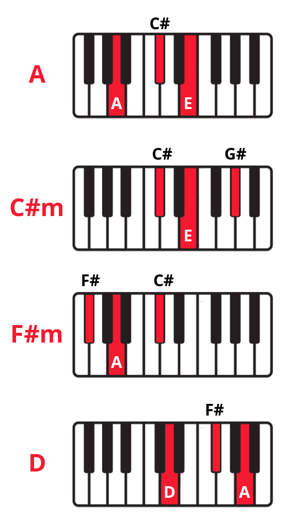 A – Root Position C#m – 2nd Inversion F#m – Root-Fifth-Root D – 2nd Inversion