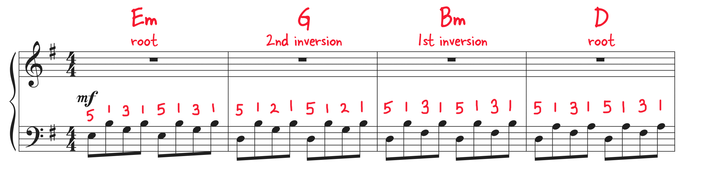 These shapes can feel awkward, especially if you’re new to piano. If you’re struggling, check your posture, relax your hands, and here’s a tip: rotate your wrist with the notes. Let your entire wrist move you in the right direction.