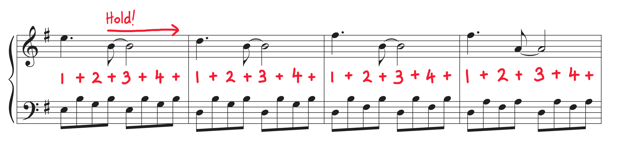 This pattern stays in your left hand throughout the entire piece, so practice it well!