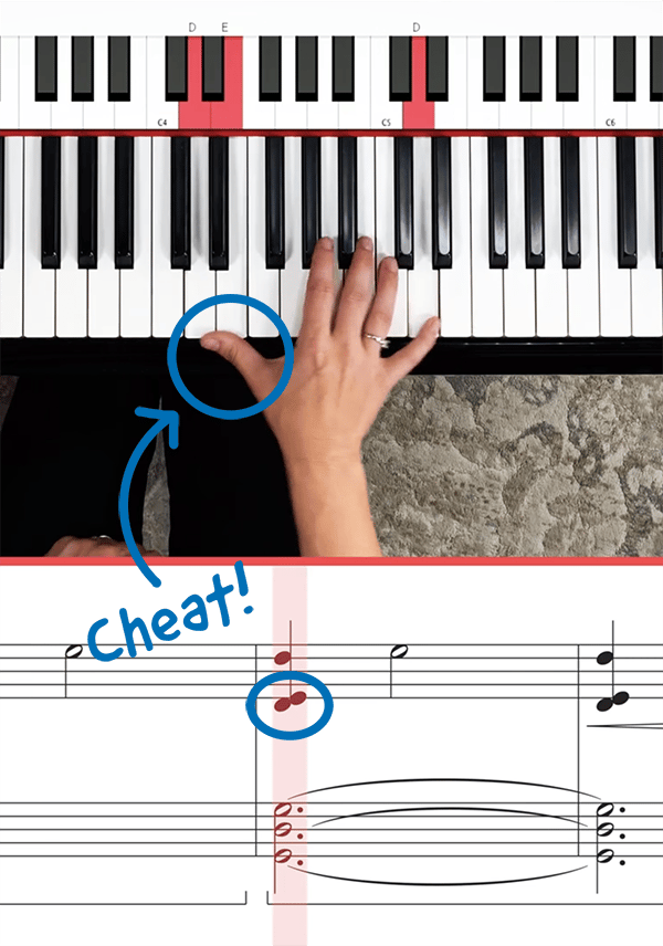 And here’s a trick to get that big C-D-D chord: use your thumb to play two notes at once!