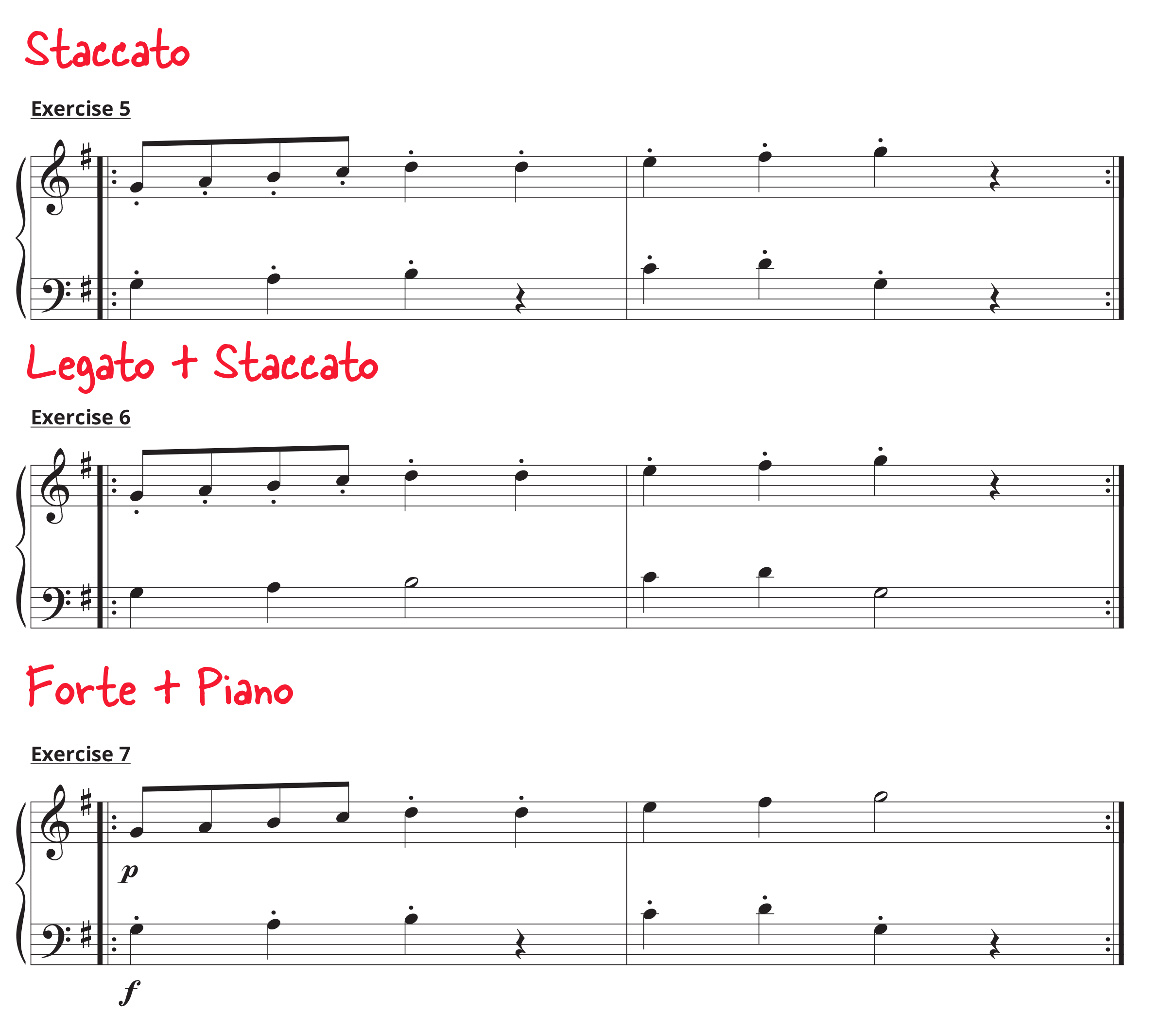 Finally, experiment with dynamics. Play everything softly, everything loudly. For added complexity, play one hand loudly and one hand softly. It’s a challenge!