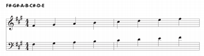 As you can see the notes are F#-G#-A-B-C#-D-E. Another way to think of it is the A major scale — but starting on F# (A is the relative major).