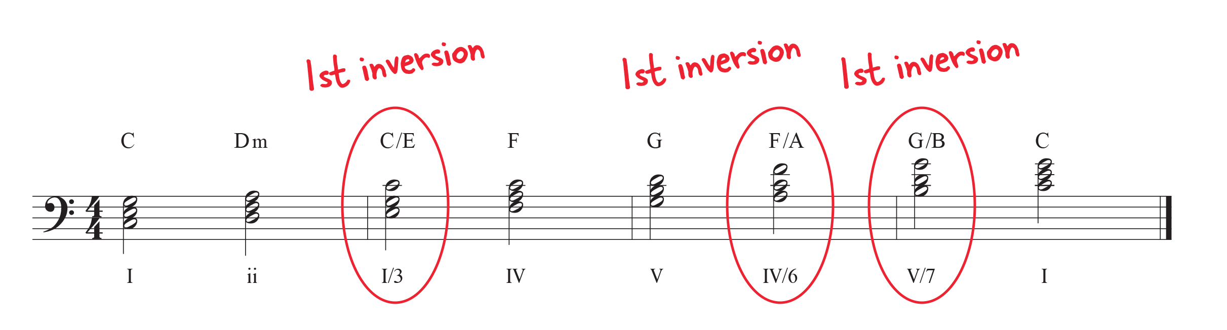 The Arabic numbers after the slash in chords C/E, F/A, and G/B just indicate what degree of the scale the lowest note of that chord is. These chords are still the I (one chord), IV (four chord), and V (five chord), respectively because their root notes are C (I), F (IV), and G (V) — they’ve just been inverted.