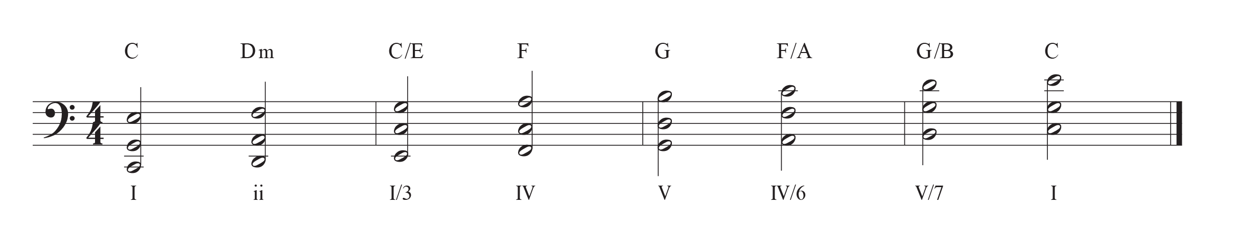 By the way, the Roman numerals under the chords are the chord’s diatonic names. The number indicates what degree of the scale a chord is built on. Lowercase numbers are minor chords. So, because D-F-A is built on the second note of the C Major scale and a minor chord, it is our ii (“two chord”).