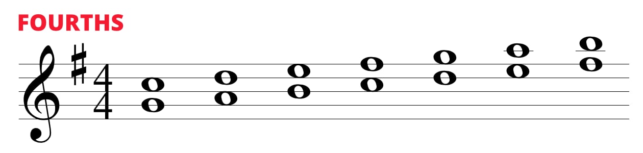 Similar to thirds, fourths are another very common interval. The top note is one step higher than a third (which is why it’s called a fourth!). Here’s what that looks like: