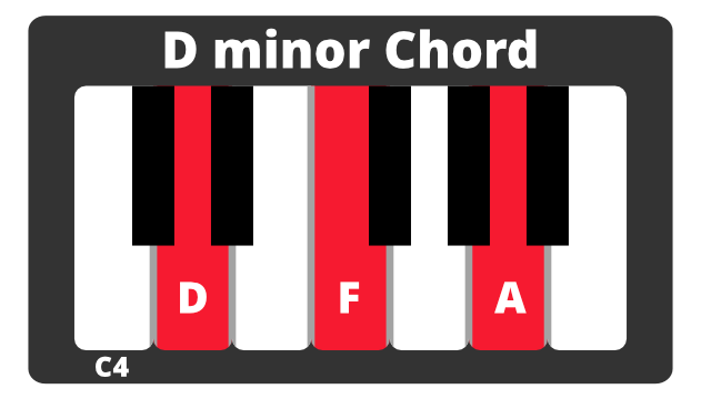 A D minor chord has the notes D – F – A. (Don’t worry about that C4, that’s just a fancy term for middle C so we know where we are on the piano!)