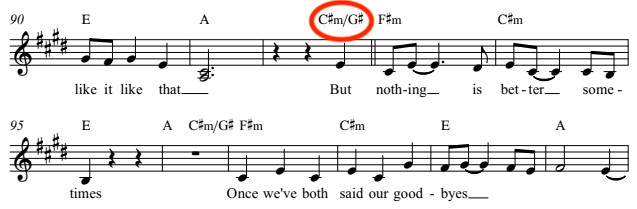 We enter the bridge with a passing chord, and it’s also a slash chord. It’s this freaky C#m/G#. It appears in the intro to the bridge and the second line: