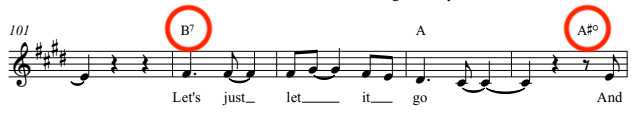Here’s where things get easy. Take a look at the chord BEFORE that A#o chord. It’s an A major chord. And what are the notes of an A major chord?