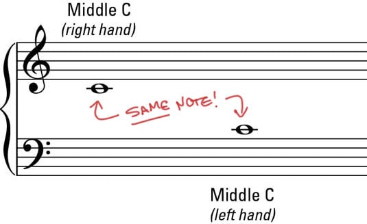 It may appear as though Middle C is 2 different notes in your sheet music, but it is just the spacing of The Grand Staff that makes it look this way. In reality: