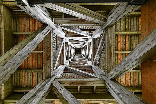 The stairs of the observation tower Alpenblick in Ulrichsberg, Upper Austria, seen from the basement of the tower.